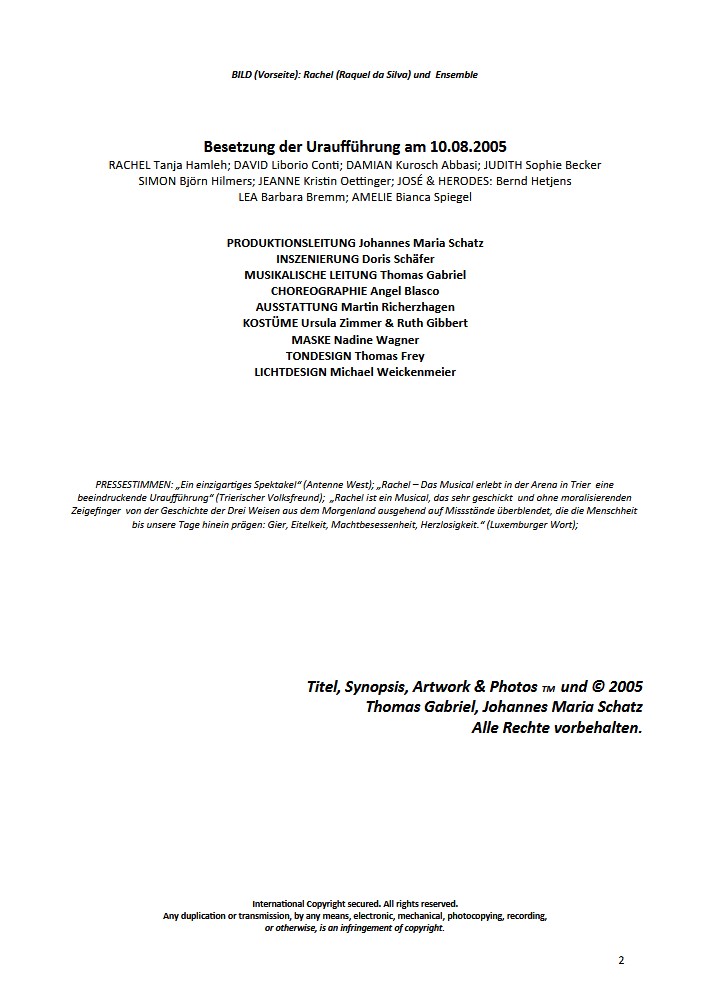 So lässt sich das Musical-Erlebnis von „Rachel“ noch einmal in Bild und Ton nacherleben – mit den Originaldarstellern und der Musik von Thomas Gabriel sowie dem Libretto von Johannes Maria Schatz.